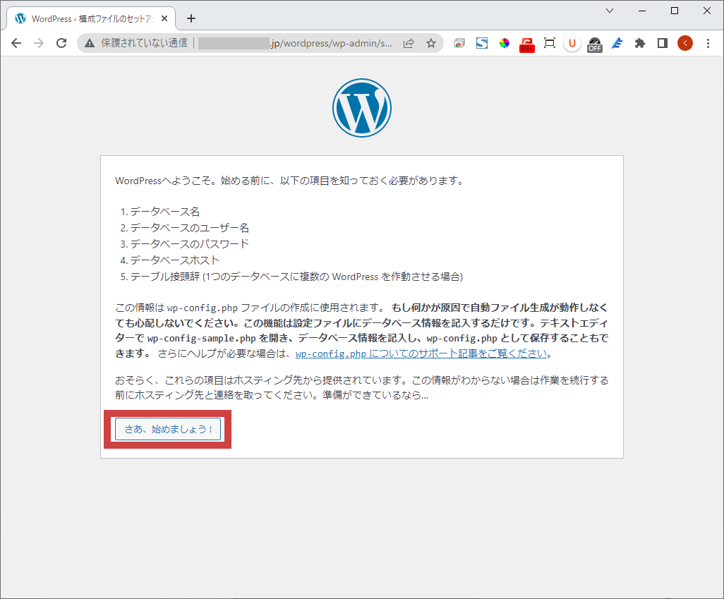 すると、以下のようにWordPressの設定画面が表示されるので、「さあ、始めましょう!」をクリックして設定を行おう。