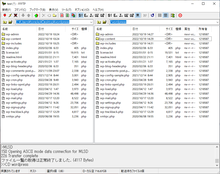 まず、以下のように、FFFTPの左側の画面(ローカルフォルダ)に先ほどダウンロードして解凍したWordPressのフォルダを開き、右側の画面にはWordPressを格納するフォルダを開いておこう。