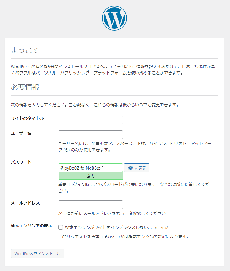 サイトのタイトル(任意)、ユーザー名(任意)、パスワード(任意)、メールアドレス(情報を受け取るアドレスを指定)、検索エンジンでの表示(チェックは付けないことを推奨)を入力・選択し、「WordPressをインストール」をクリックしよう。