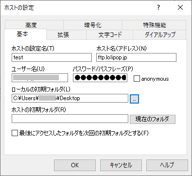 ホスト名(アドレス) | 契約したサーバーのアドレス 例:ロリポップサーバーの場合は「ftp.lolipop.jp」 |