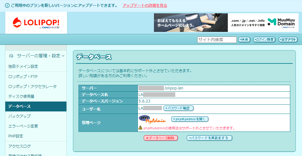 なお、サーバー管理画面から内容を確認できる場合もあるので、分からなくなったらログインして確認してみよう。例えばロリポップサーバーの場合、以下のようにデータベース情報を確認できる。