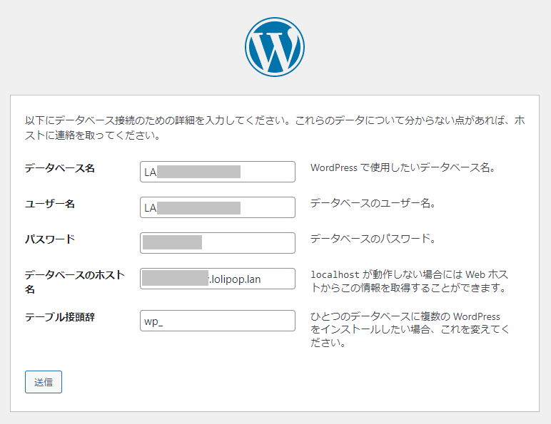 次に、以下のようにデータベースの詳細を入力する画面が表示されるので、「3-2. サーバーでMySQLデータベースを作成する」で設定した情報を入力しよう。