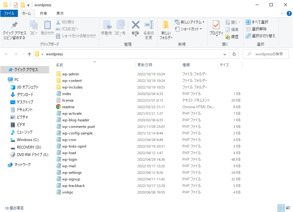 解凍が完了すると、以下のような「wordpress」のフォルダに展開される。