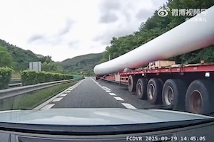 これは何だろう。風力発電の羽っぽいけどこんな丸かったっけ。中国の高速道路で撮影された超巨大輸送の内輪差に巻き込まれてしまった車のドライブレコーダーです。これだけ長いのに先導車や後導車(誘導車)が無いんだね。