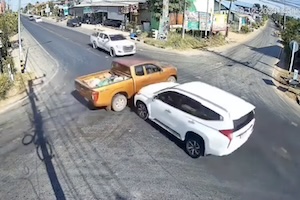 映像からは分かりませんが現場のGoogleマップを見ると「止まれ(หยุด)」の標識がありますね。タイのムアンノン・ブアラムプー地区フアナの交差点で撮影された大事故のビデオです。この事故で1人が亡くなっています。