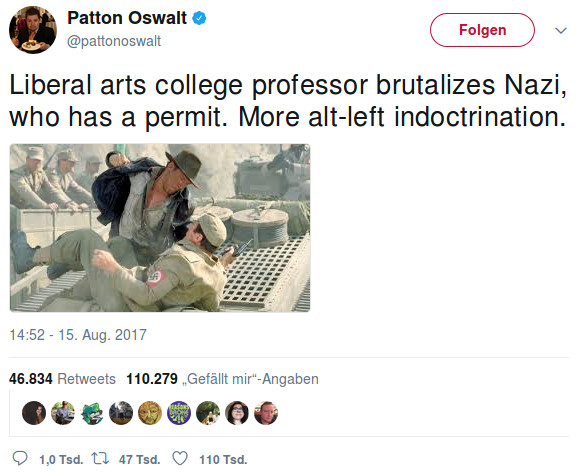 Was der Terminator sagt: Neonazis sind Loser, ihre Vorbilder sind Verlierer, und es gibt keine zwei Seiten, welchen man zuhören müsse. Sondern nur die der Vernunft und des Anstands. Und die Pflicht, gegen die Nazis, Hassprediger und Rassisten zu kämpfen, nehmen eine ganze Reihe von Populisten nicht wahr. Nicht nur Trump und seine karrieregeilen Gefolgsleute, sondern auch europäische Nationalisten und Reaktionäre. Wir sollten uns ein Beispiel an The Arnold nehmen und die Feinde der Demokratie und aller Verfassungswerte verachten und auslachen. via boingboing