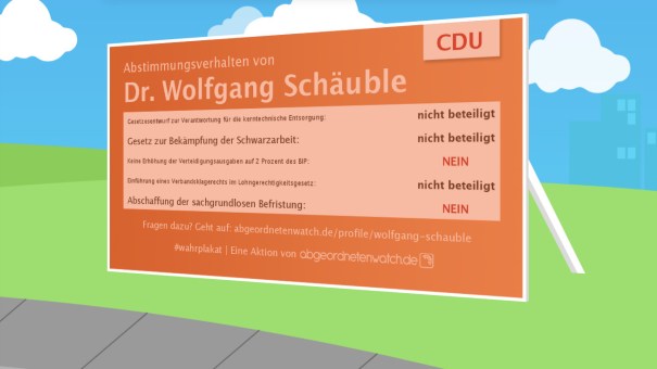 Den Abgeordneten im Bundestag auf die Finger schaun? Ganz einfach, mit diesem neumodischen Internet. Von dem man grade so viel liest. In der Zeitung. Einfach auf diese Seite von Abgeordnetenwatch gehen, den/die Lieblings-Bundestagsabgeordnete(n) auswählen, dann bis zu fünf Abstimmungen raussuchen und auf „Plakat erstellen“ klicken. Schon sehen wir, dass zB ein gewisser Wolfgang Schäuble aus Offenburg keine besseren Rechte für Arbeitnehmer, aber mehr Militärausgaben will, und ansonsten nicht oft da ist. Viel Spass!