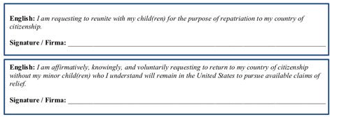 In den derzeit proto-faschistisch regierten, aber von sehr vielen netten und anständigen Leuten bewohnten USA werden derzeit schutzsuchenden Familien die Kinder weggenommen, damit man sie anschliessend erpressen kann. Das abgebildete Formular wurde dem Southern Poverty Law Center zugespielt, so etwas müssen Leute mit laufendem Asylverfahren unterzeichnen, um anschliessend mit oder ohne ihre Kinder das Land zu verlassen. via boingboing