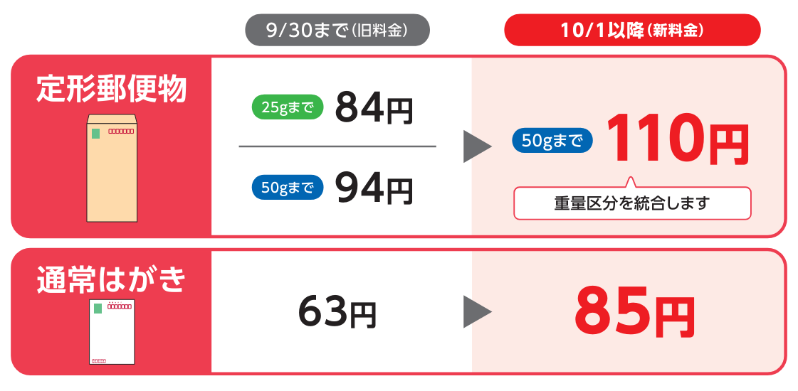 ・2024年10月から郵便料金が15〜30%値上がりします。