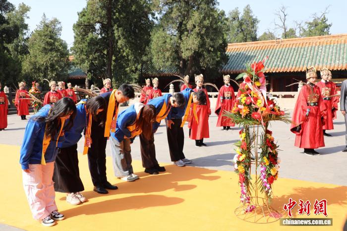 4月1日,2025海峡两岸孔子文化春会两岸青年同祭孔在山东曲阜孔庙举行,台湾青年代表敬献花篮。李明芮 摄
