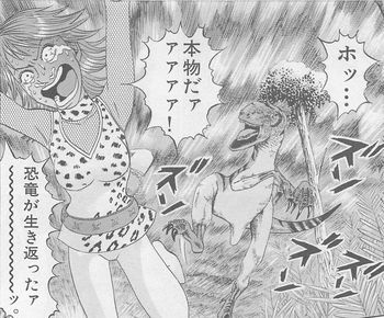 ダイナスリップは、ジュラシックパーク並みに超リアルな恐竜がパーク内を走りまわるテーマパークなのでした。潜入したラン子知事もビビりまくり。