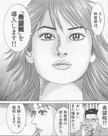 公共事業の凍結、そして県の成人全員に対し月額1万円「希望税」の導入。これにより、出産費用、18歳までの医療費、不妊治療費、そして託児所を全額県の負担とし、18歳になるまで子供1人あたり毎年50万円が振り込まれます。これは思い切った施策ですね。実現すれば本当に少子化が解決してしまうかもしれません。しかし・・・