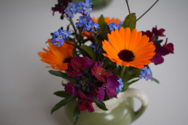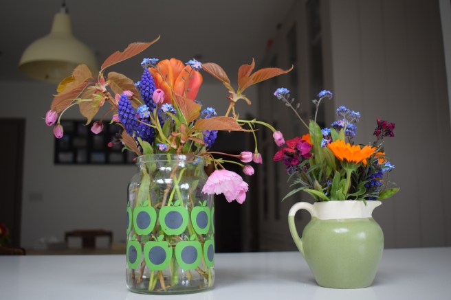 I also took a few photos while I was in the garden to give you a flavour of what’s going on out there. Look at that orange tulip with the forget-me-nots – I’m fairly sure it’s a ‘Hermitage Double’; there aren’t enough to pick for a vase so I have made a note to plant more for next year. Always more tulips 🙂