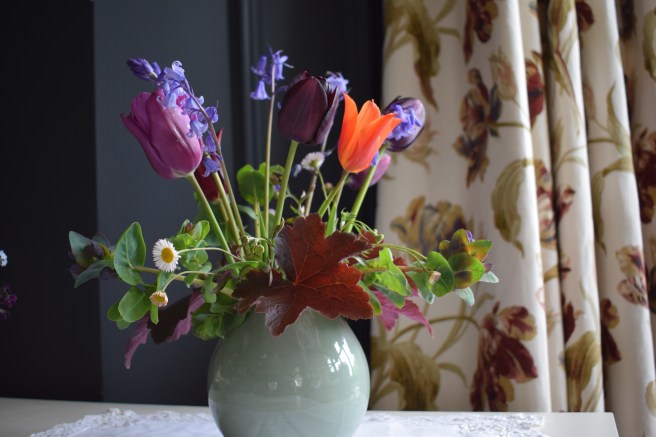 Today has been cloudy and cold, with a strong wind and not conducive to spending hours in the borders, but I did have a wander and collected a few treasures so that I could join Cathy for a Monday vase. Four different varieties of tulip (‘Queen of Night’, ‘Sarah Raven’, ‘Ballerina’ and a violet-purple one whose name I can’t recall), some bluebells from the bottom of the garden, Cerinthe major (overwintered), Erigeron karvinskianus, which is coming into flower on the steps and walls, and some Heuchera leaves.
