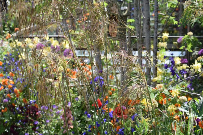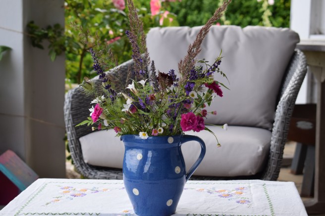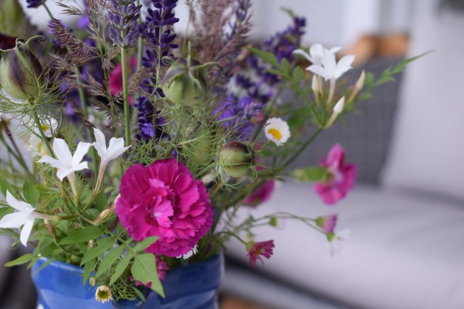 Anyway, flowers… The garden has been quietly getting on with itself since the village garden safari. I’ve been watering and feeding the veg and roses, dead-heading and doing the occasional half hour of weeding but other than that it’s had to had to fend for itself. Happily, there is a second flush of roses and buds on ‘The Generous Gardener’ and so I snipped a few for a Monday vase. There’s a large patch of pale pink phlox (unknown variety) that’s coming into bloom, so I cut a few of those, too. Too much pink? No. I added a few spires of pink snapdragon (Antirrhinum majus ‘Appleblossom’), which are flowering beautifully, and a single marigold (Calendula officinalis ‘Sunset Buff’). Too much pink? Maybe. So I snipped a couple of orange Crocosmia and Perovskia ‘Blue Spire’ to add a little contrast. It all smells amazing and I’m pretty bowled over by that rose.