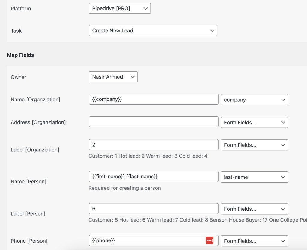 Next, match the required lead fields with the information from your form. You can also include details about the organization and the person related to the lead. This ensures all the necessary information is correctly linked in Pipedrive.