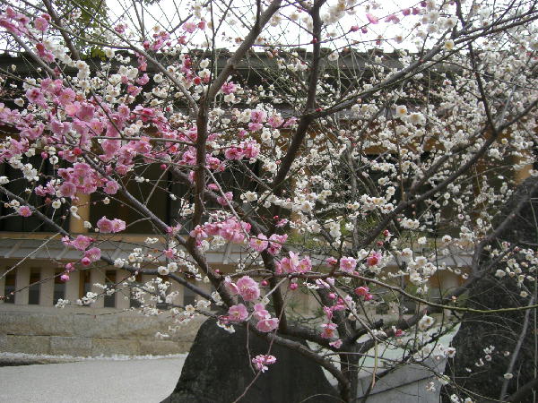 1本の木から紅梅と白梅がついています。