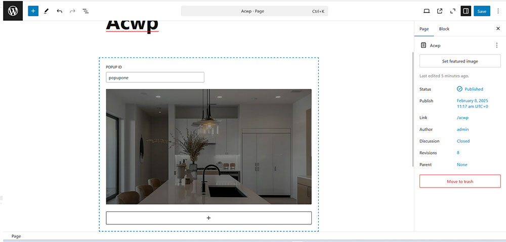- Insert the Popup Block into your post or page.