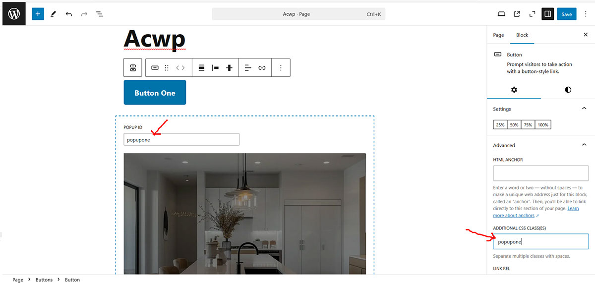 - Enter a unique Popup ID in the block settings.