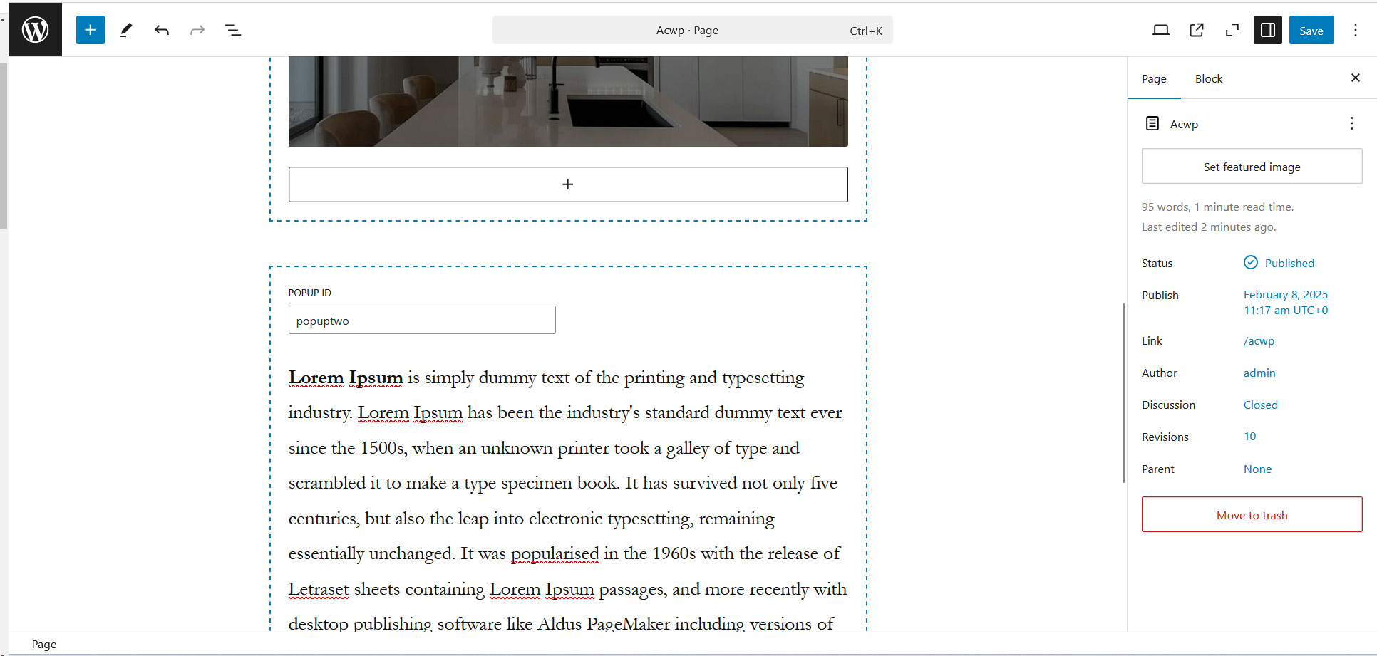 Acwpblocks – popup block is a Gutenberg block that allows you to create popups that can be triggered by any button or link with the same class as the popup ID.