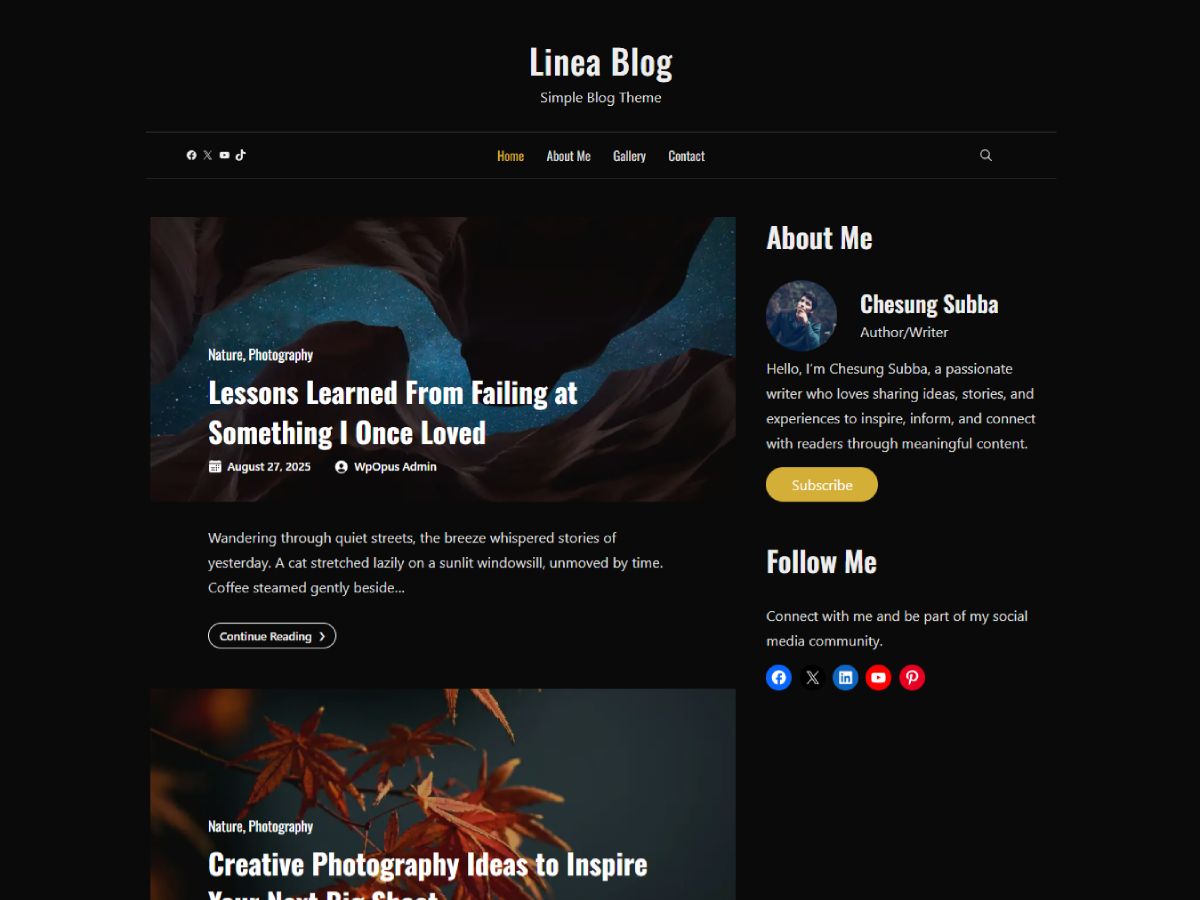 Linea Blog is a clean and minimal WordPress theme designed for writers, professionals, and creatives who value simplicity. With its distraction-free layout, it highlights your content, making it perfect for personal stories, professional updates, or creative expressions while offering readers a smooth and engaging experience.
