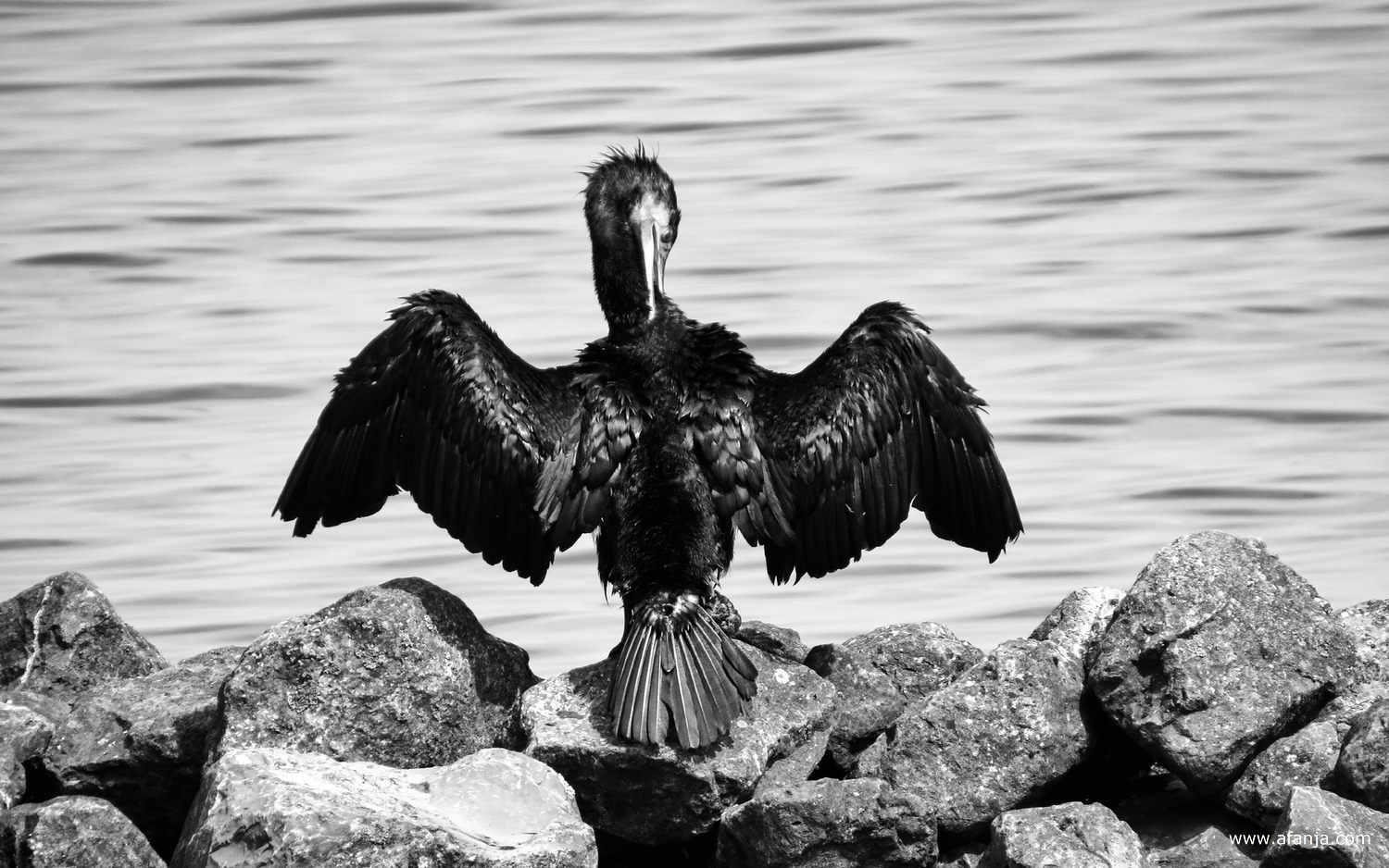 Nee, ik heb het niet over de voorjaarsschoonmaak. Die ene voorjaarsdag die ons deze week in het vooruitzicht is gesteld, kan wel beter gebruikt worden. Nee, ik heb het nu even over de aalscholver, die op een rij grote stenen langs de oever zijn veren aan het poetsen was. Voor hem is dat poetsen van levensbelang …
