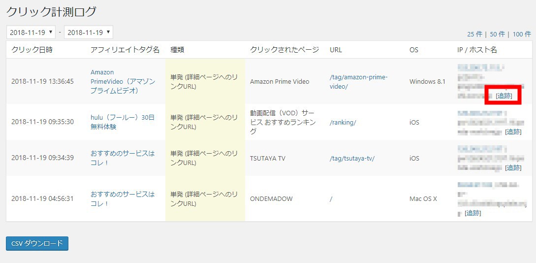 ログを確認し、気になるクリックの「追跡」をクリックします。