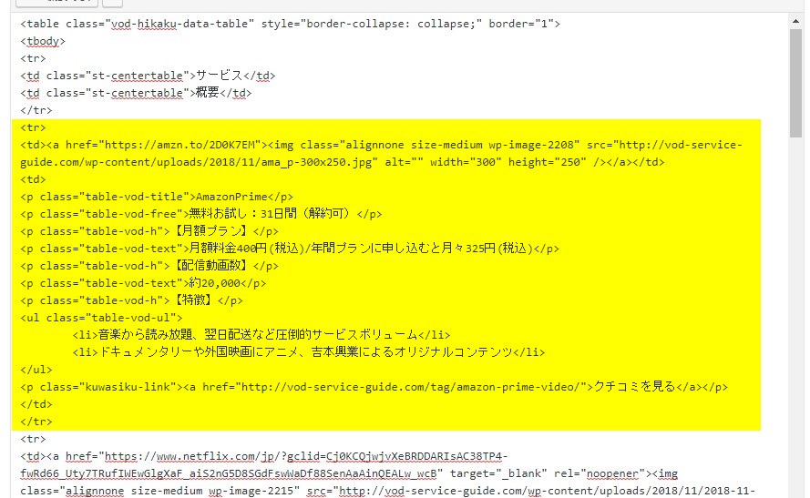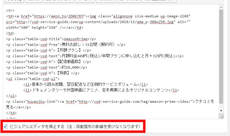 <tr>で抜いているので自動整形されないように「ビジュアルエディタを停止する」を有効化して下さい。