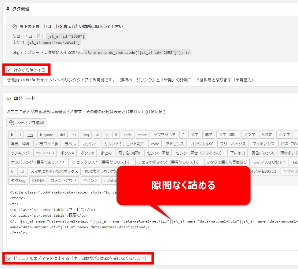 また、レイアウトに隙間ができるような場合は各ショートコードの隙間を無くし、「ビジュアルエディタを停止する」を有効化して下さい。