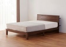 リビングダイニングの家具と同様に、木の温もり溢れる無垢材のベッドフレームを選びました。無垢材でしか感じることのできない質感と木目に癒されます。ヘッドボードの裏には収納棚が付いており、時計や植物などの小物をおしゃれに飾ることができます。