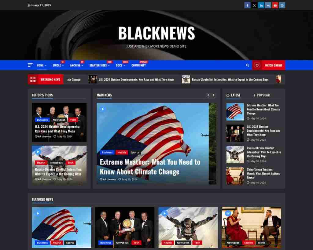 BlackNews is a modern, dark newspaper-style WordPress theme designed for news, blogs, and magazine publishers seeking a bold and professional design. Fully compatible with popular page builders like Elementor, Gutenberg, Brizy, Beaver Builder, Visual Composer, and Divi, it offers exceptional design flexibility. This responsive, SEO-optimized theme supports major plugins such as WooCommerce, Jetpack, Contact Form 7, and Yoast SEO, enabling the creation of feature-rich websites. Multilingual and RTL-ready, with demo content available in English, Spanish, Chinese, Arabic, French, and Japanese, BlackNews caters to global audiences. Its lightweight structure and fast-loading performance ensure optimal user experience, while features like 1-click demo import, customizable widgets, diverse layout options, and banner areas make setup intuitive and content presentation engaging. Perfect for news portals, blogs, and magazines, BlackNews combines sleek functionality with a captivating dark design.