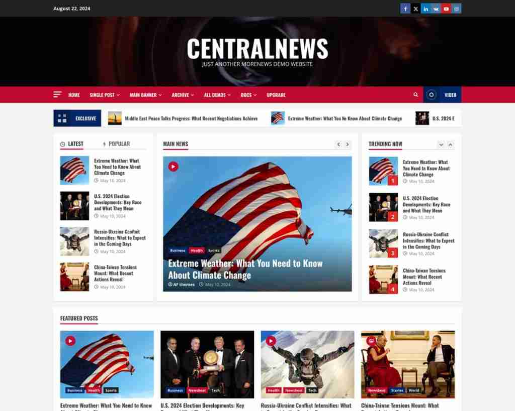 CentralNews is a user-friendly WordPress theme designed for news, blog, and magazine websites. It lets you quickly set up your site with one-click demo imports and easily manage content using 9+ custom widgets. The theme offers stylish options like various banners, light/dark mode, and is customizable via the live customizer. Supporting RTL languages and compatible with Elementor, Gutenberg blocks, and WooCommerce, it even allows for seamless integration of an online store. CentralNews is optimized for search engines and comes with dedicated support. Explore demos and documentation at https://afthemes.com/products/centralnews/.
