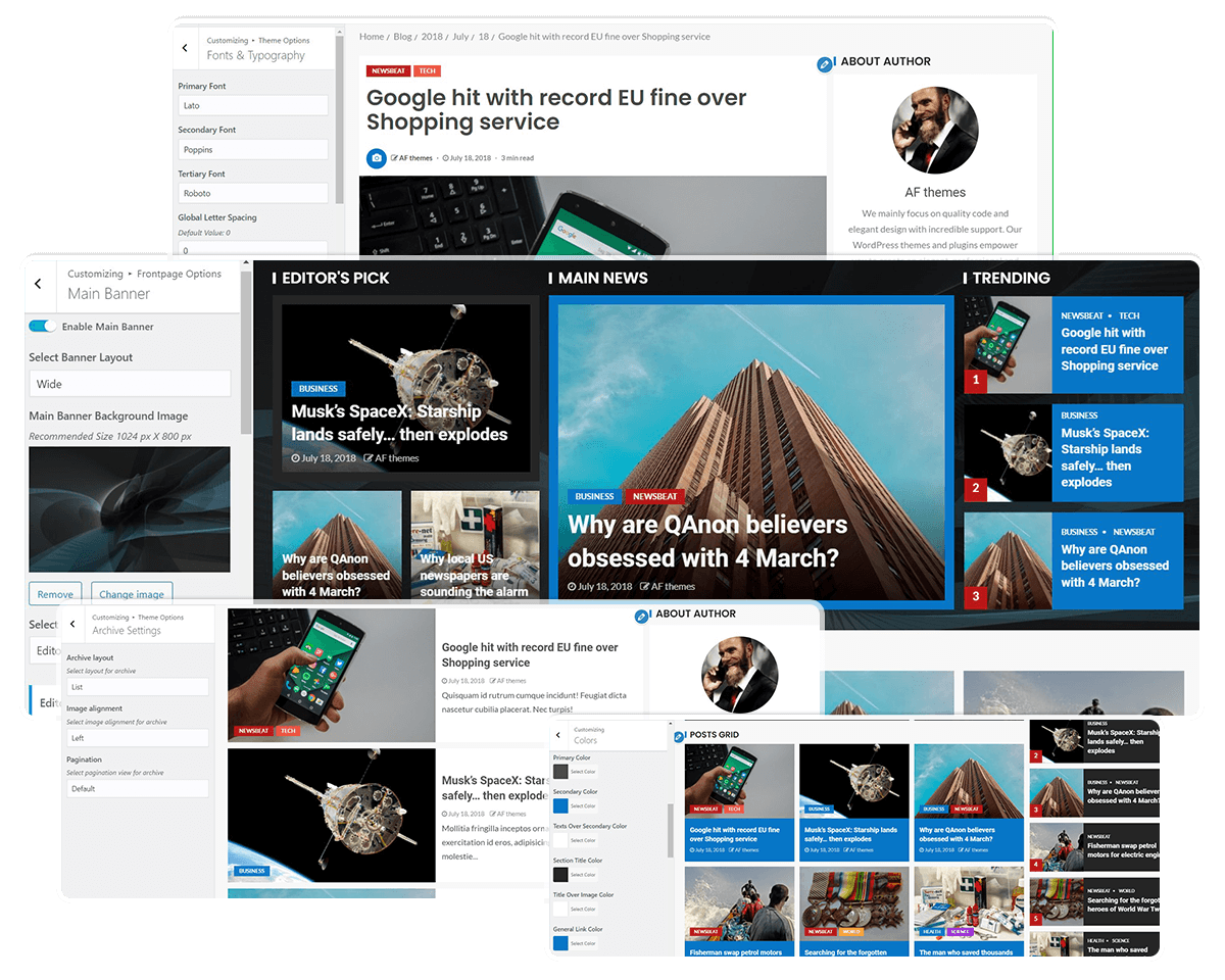 The main banner layouts and customizer options come with a variety of choices and will allow you to present your blog entries in a banner format.