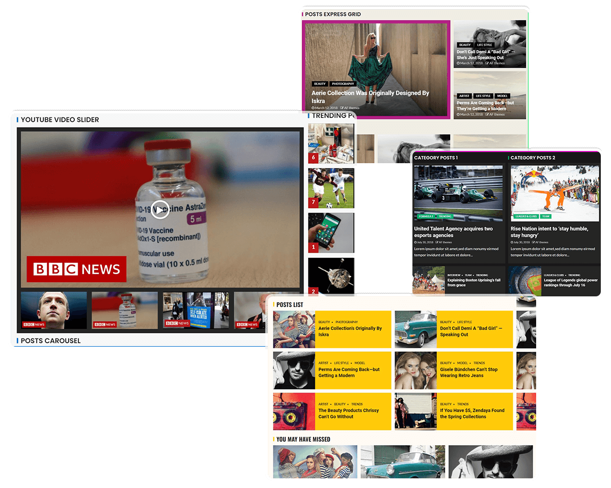The post widgets like slider, grid, list, carousel, trending, youtube video, author box, and social links designs of the combo will help you present your articles in a stylish manner.