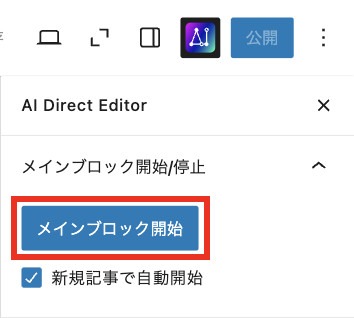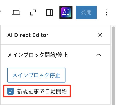 ブロックエディター右上のアイコンを開き、[新規記事で自動開始]をクリックします。