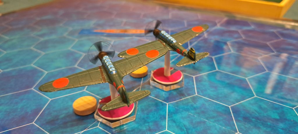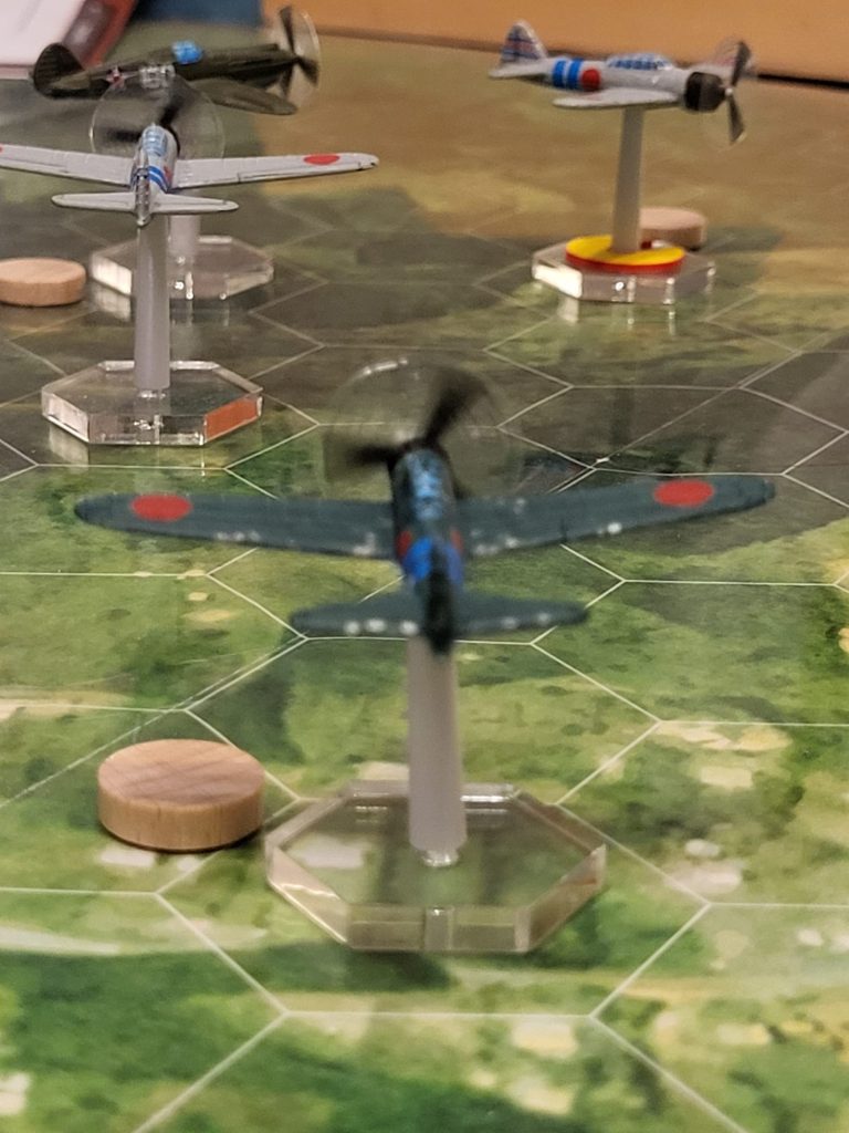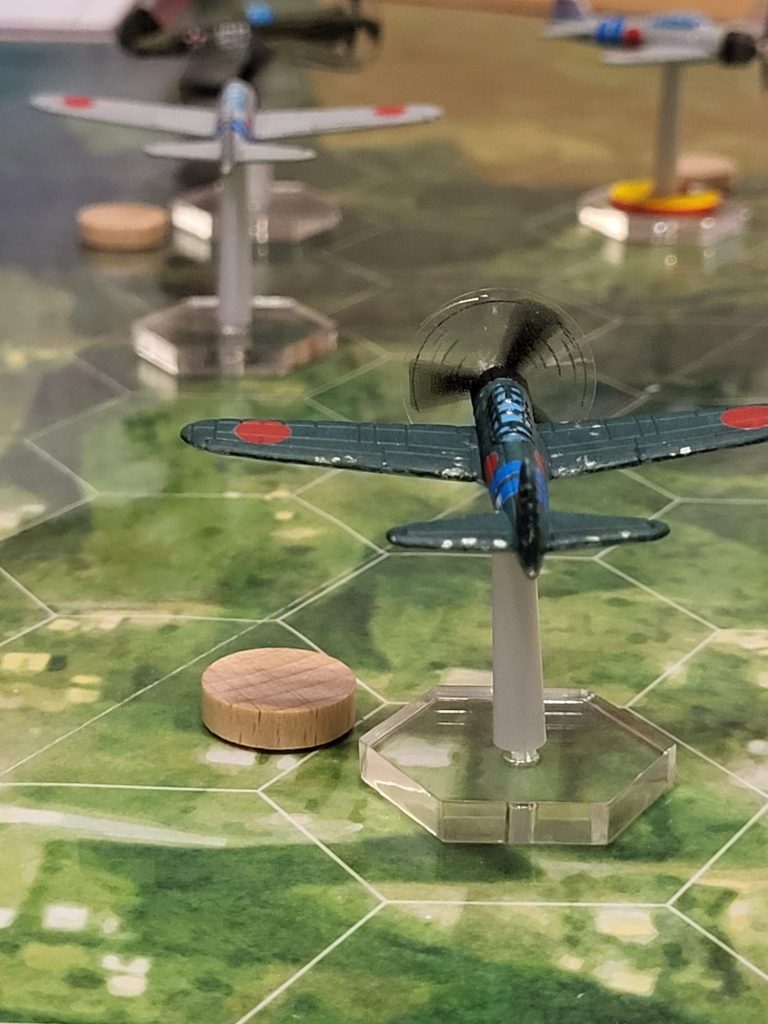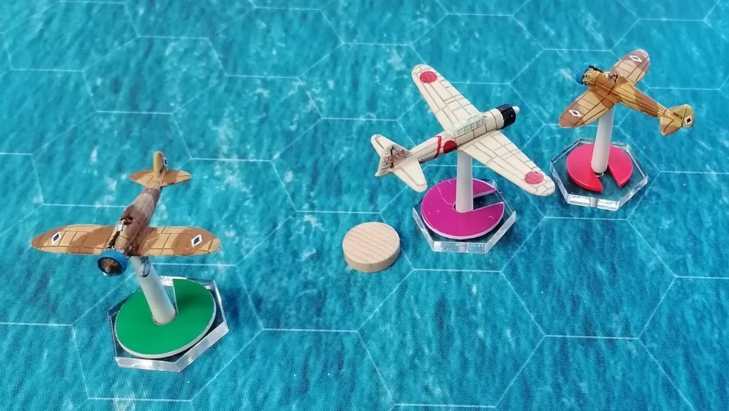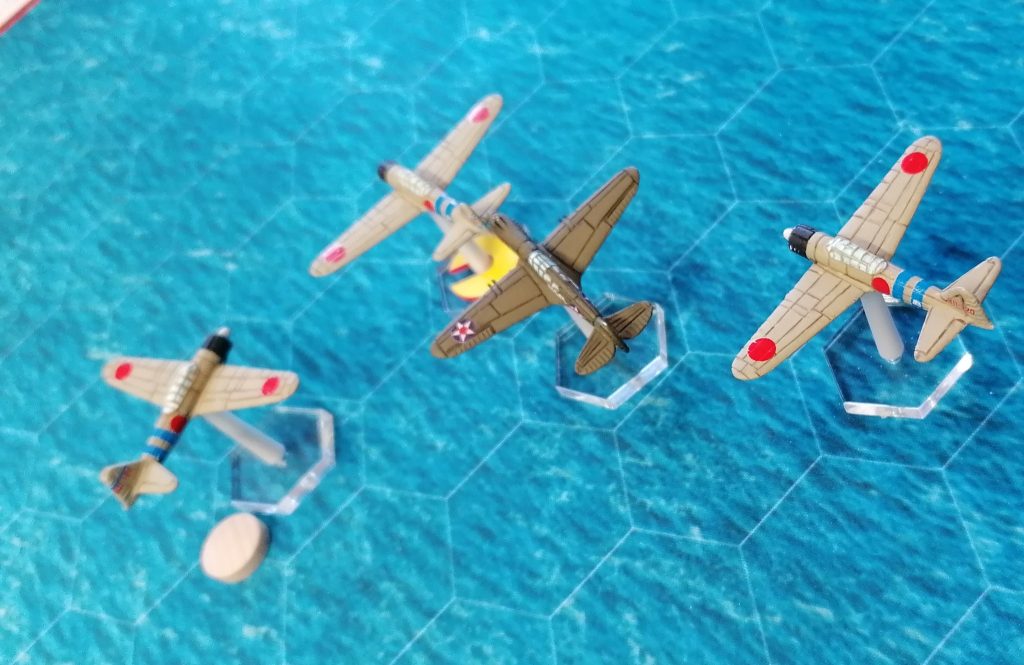 So, gestern das Erste AirRaid Spiel absolviert, aber dazu später mehr. Hier eine Regelfrage: Japan hat die Initiative gewonnen und 3 Flugzeuge. US hat nur noch eins, verfolgt aber einen Japaner. Wie ist die Zugreihenfolge? [Antwort Babek: Seite 21: „Im letzten Zugwechsel bewegen beide Seiten immer jeweils nur 1 Flugzeug.“ Somit muss Japan auch bei gewonnener Ini 2 seiner Flugzeuge vor dem US-Flugzeug (welches die Ini verloren hatte) bewegen. Zudem besteht eine Tailing Situation. Die P-40 hat das Recht, nach der von ihm getailten Zero zu ziehen. Der Japan-Spieler sollte also die getailte Maschine gemeinsam mit einer weiteren Zero bewegen, so dass die dritte Zero und die P-40 für den letzten Zugwechsel übrig bleiben. Dann muss die P-40 ziehen und als letztes der Inigewinner Japan seine letzte Zero. Würde der Japan-Spieler nicht die getailte Maschine ziehen, so dass diese übrig bleibt im letzten Zugwechsel, dann muss er diese gemäß Tailingregel vor dem iniverlierer USA ziehen. Wenn eine Seite nur 1 Flugzeug besitzt und die andere mehr, dann ist es in der Tat wie von Dir beschrieben so, dass im letzten Zugwechsel das 1:1 nicht mehr gilt.]