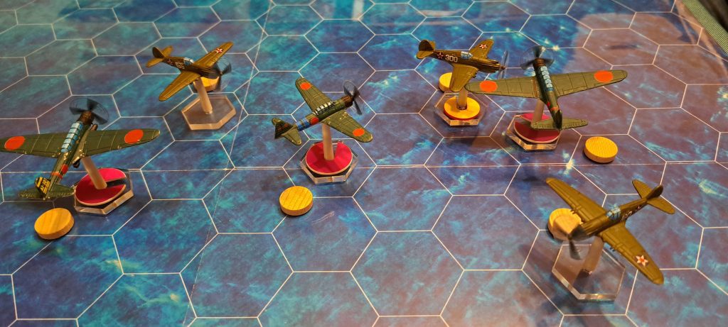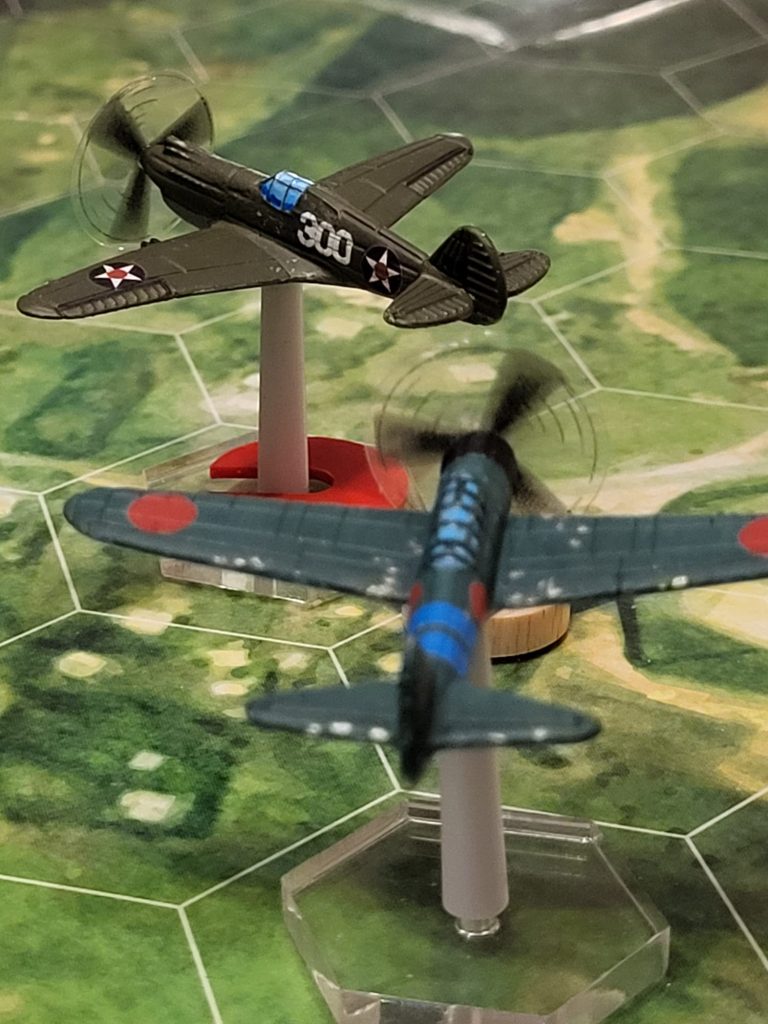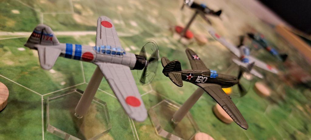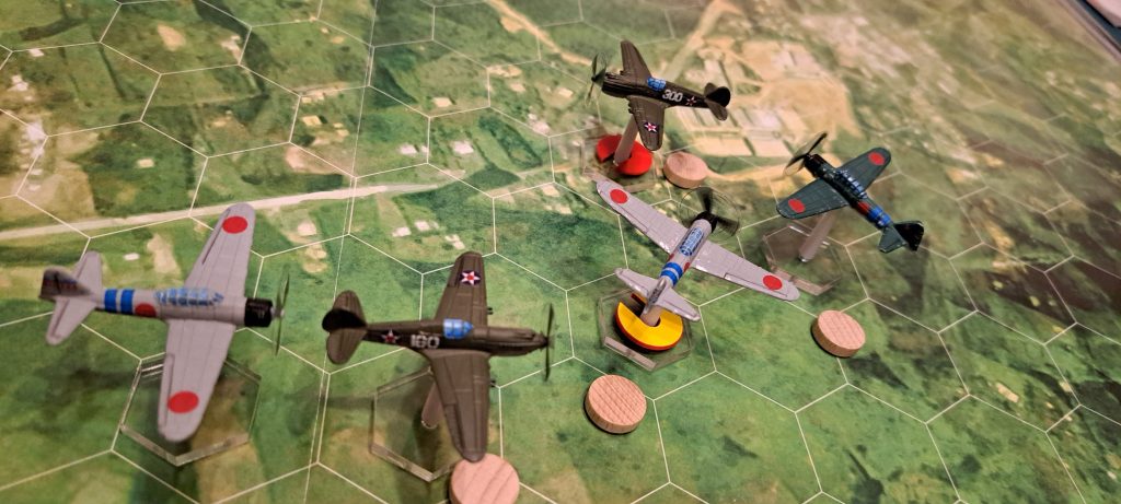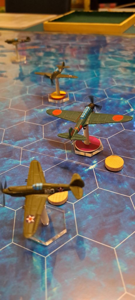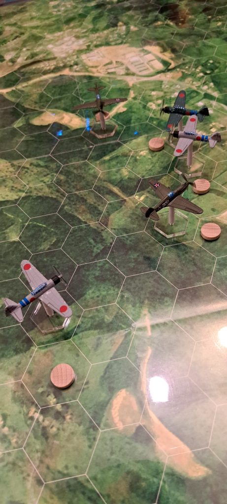 Wir haben unsere ersten 2 Scenarien aus dem Regelbuch gespielt. Im ersten Match haben die Japaner einen entscheidenden Erfolg erzielt, beide P40 vom Himmel geholt und keine Maschine verloren.