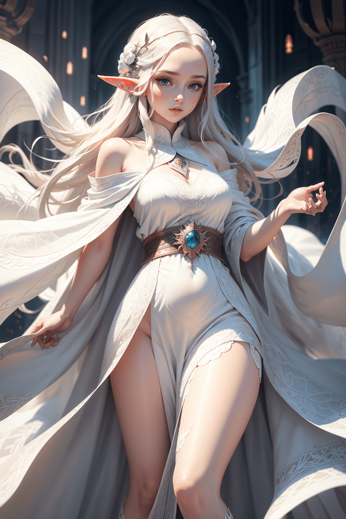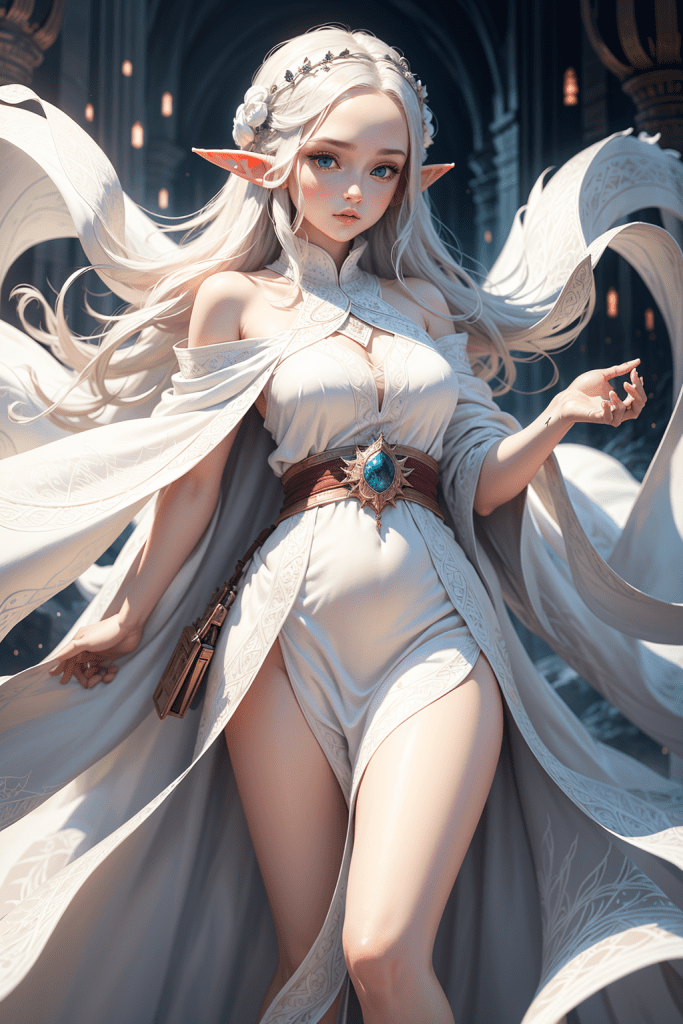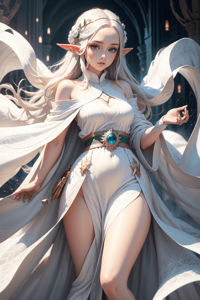 (elf:1.2) 1girl, flowing white dress, white cloak, flowing, (fabric with intricate pattern:1.2), (insanely detailed:1.2), ((masterpiece)), (painting:1.1), (digital painting:1.1)