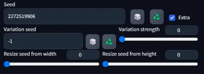 Same as with the high-level Seed, variation seed comes with a Dice button which will set it at -1 (random every time) and a Recycle button which will reuse the last used variation seed.