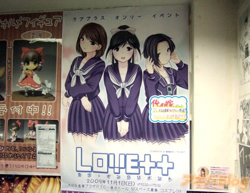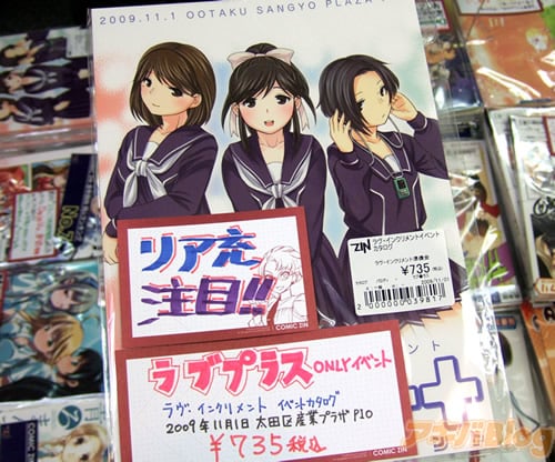 『ラヴ・インクリメント(Love++)』は、11月1日(日)に大田区産業プラザPIO小展示ホールで開催される同人誌即売会で、イベント参加案内によると『“ラブプラス”をこよなく愛する方なら、どなたでも参加可能です』・『即売会終了後にお楽しみイベント予定、コスプレOK!』というもの。 メロンブックス秋葉原店のポスターには『俺の嫁イベント』、COMIC ZINのPOPは『リア充注目!』だった。