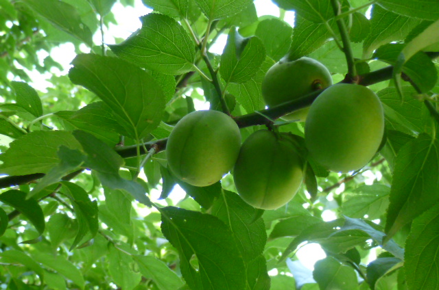 農園の小さな畑の梅の木をよく見ると青い実がなっていた。ブルーベリー畑の枝の剪定を続けた。
