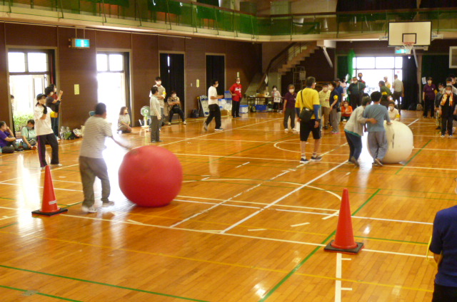 紅白の大きな玉を転がす「大玉転がし」はリレー。