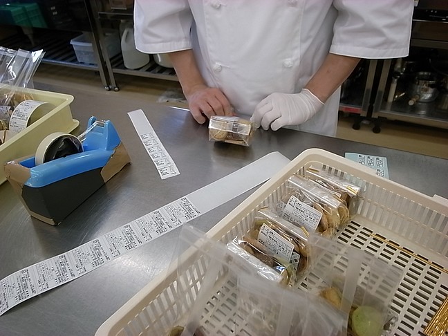 午前。森の工房みみずく(就労継続支援B型)の食品班「あき」では焼き上げたクッキーの袋詰め作業。