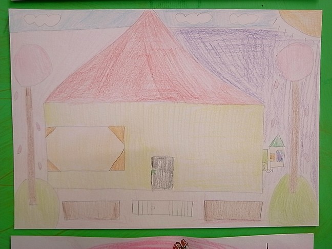 9月2日の自由活動で描いた「理想の家・へや」の作品をご紹介。第2森の工房AMAの食堂に展示されている。今回はその2。(森の工房やの生活介護)