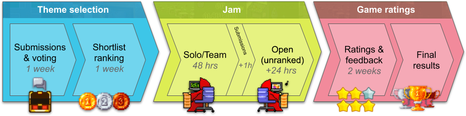 - Open, a more open division which grants about 72 hours to finish the game. Useful for those not interested in the competitive aspect of the event, want to work on an existing project of theirs, or simply did not finish their game in time.