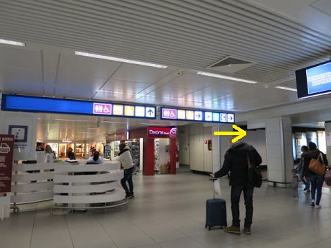 時間が押していれば、大慌て、ゲートがないと、パニックにもなりかねませんが、よくよく捜せば、このバールの奥に搭乗ゲートに向かう通路(エスカレーター)があります。正面から見れば、バールが目について、おまけに搭乗ゲートの表示も隠れて見えなくなっていますが、なんでこんなところにバールを作ったのか~。私は、ブツブツ言いながらエレベーターで下に降りて行きました。