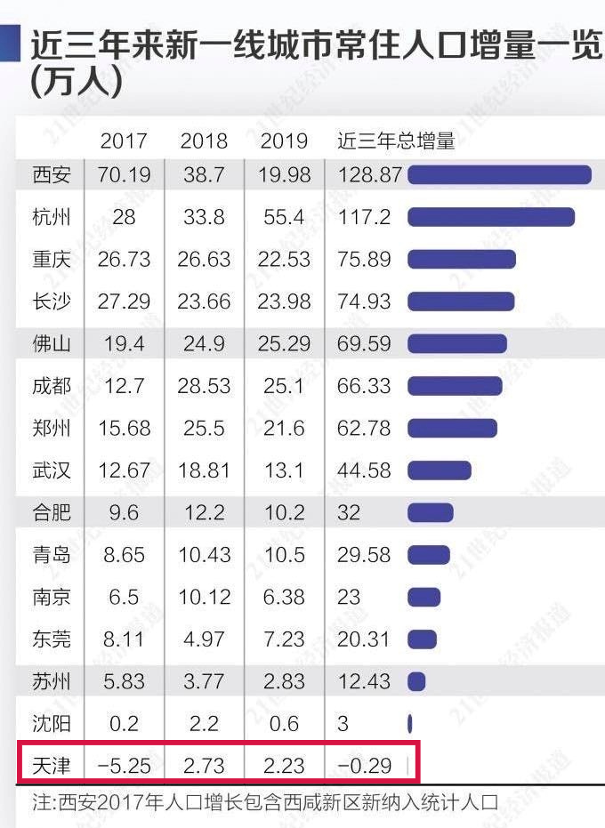 2015年,天津人口达到 1546 万人,当年新增 30 万人;但到 2016 年,新增人口数骤降至 15 万人;2017年,甚至直接出现了人口负增长 -5.25 万人;之后的 2018 和 2019 ,天津这样一个1500多万人口的巨型城市,两年的新增人口加起来,都不到 5 万人(甚至无法填补 2017 年的负增长),几乎可以忽略不计。
