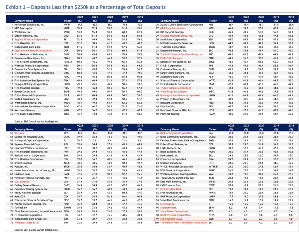 首先(图一),硅谷银行不接受私人客户,所以他们的客户存款额度都比较大,存款在25万美金以下的客户占比仅为2.7%,全美无数商业银行中排名倒数第二。而 FDIC 承保金额上限是25万美金,这意味着 97% 以上的客户存款不受 FDIC 保护。