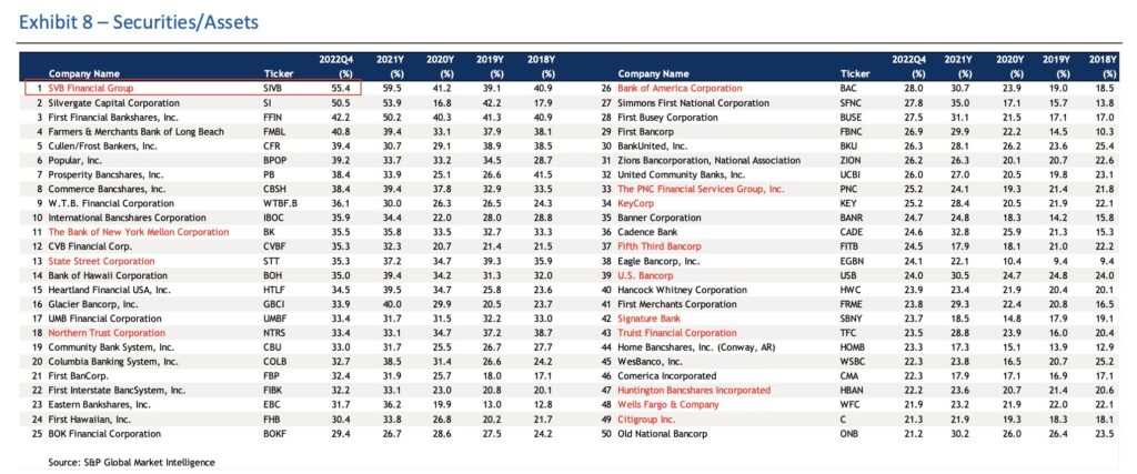 其次(图二),硅谷银行资产的的55.4%是证券,在同业中排第一名。可见硅谷银行对于自身资产的风险偏好非常激进,正经银行不会这么操作。十几年的科技大牛市所带来的超额利润,把硅谷银行的风控系统干掉了。
