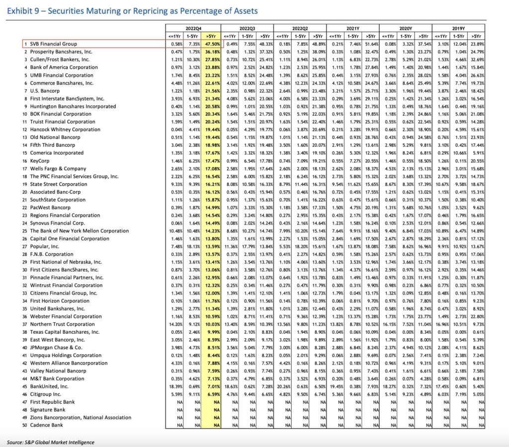 最后(图三),硅谷银行的证券资产中,47.5% 在五年后到期。这一点同样证明了硅谷银行在风险上「独树一帜」的风格,赚钱不要命。